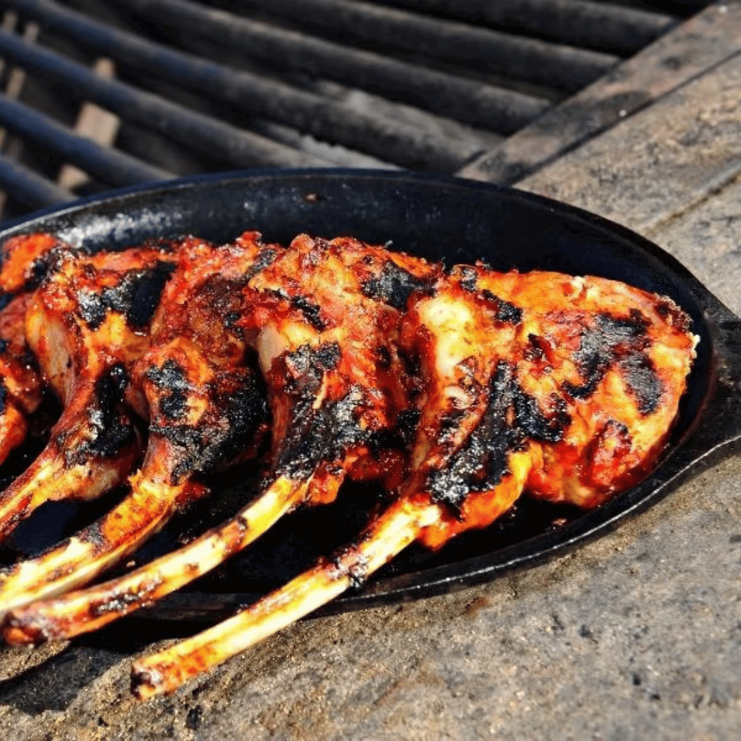 Marine edilmiş kuzu etinin şişte ızgarada pişirilmiş hali.