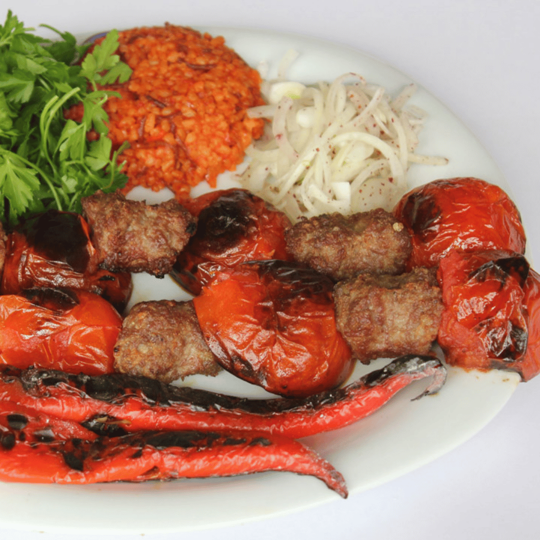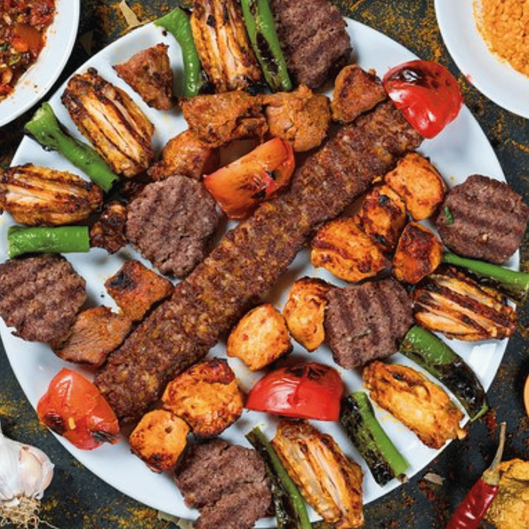 Farklı kebap çeşitlerinin bir arada sunulduğu tabak.