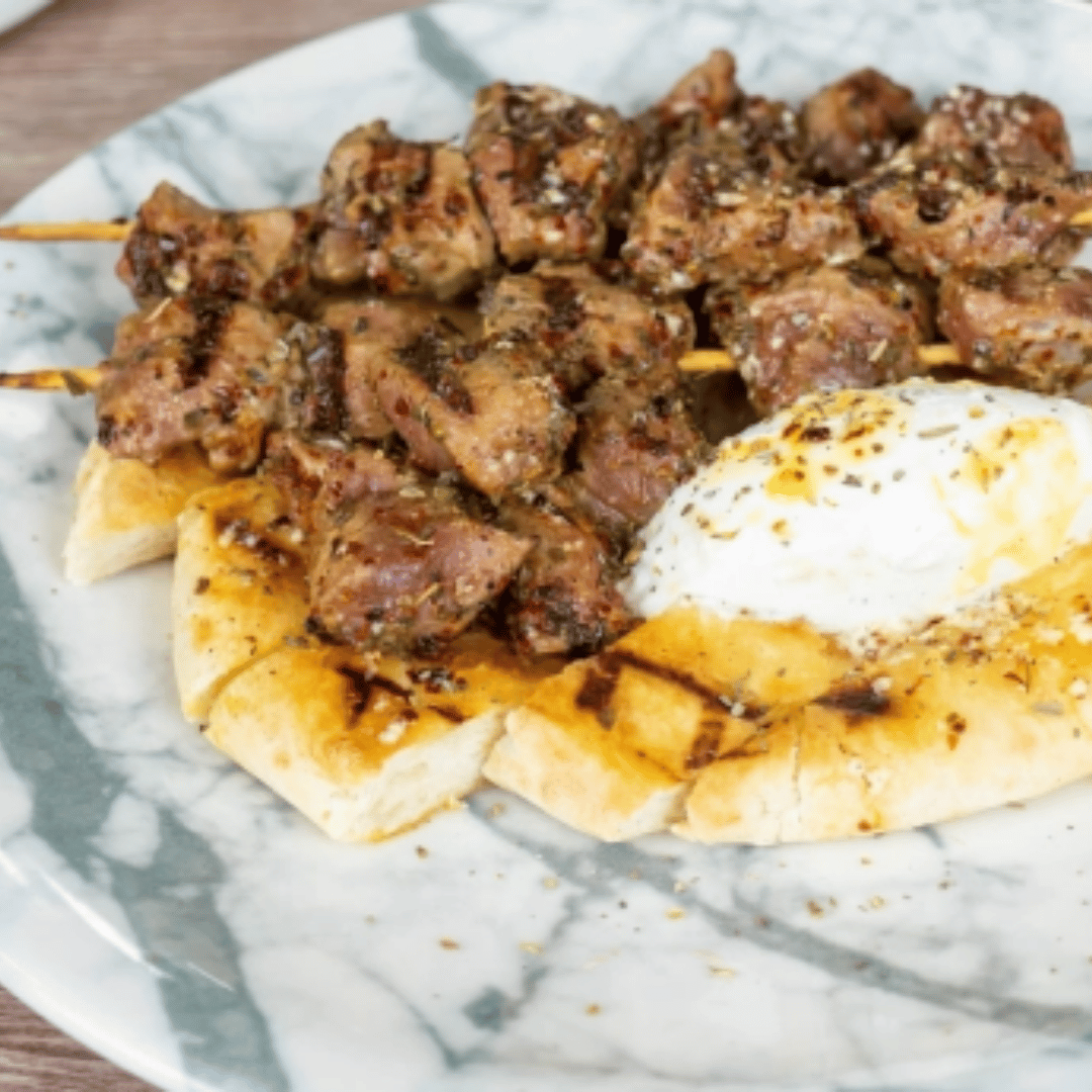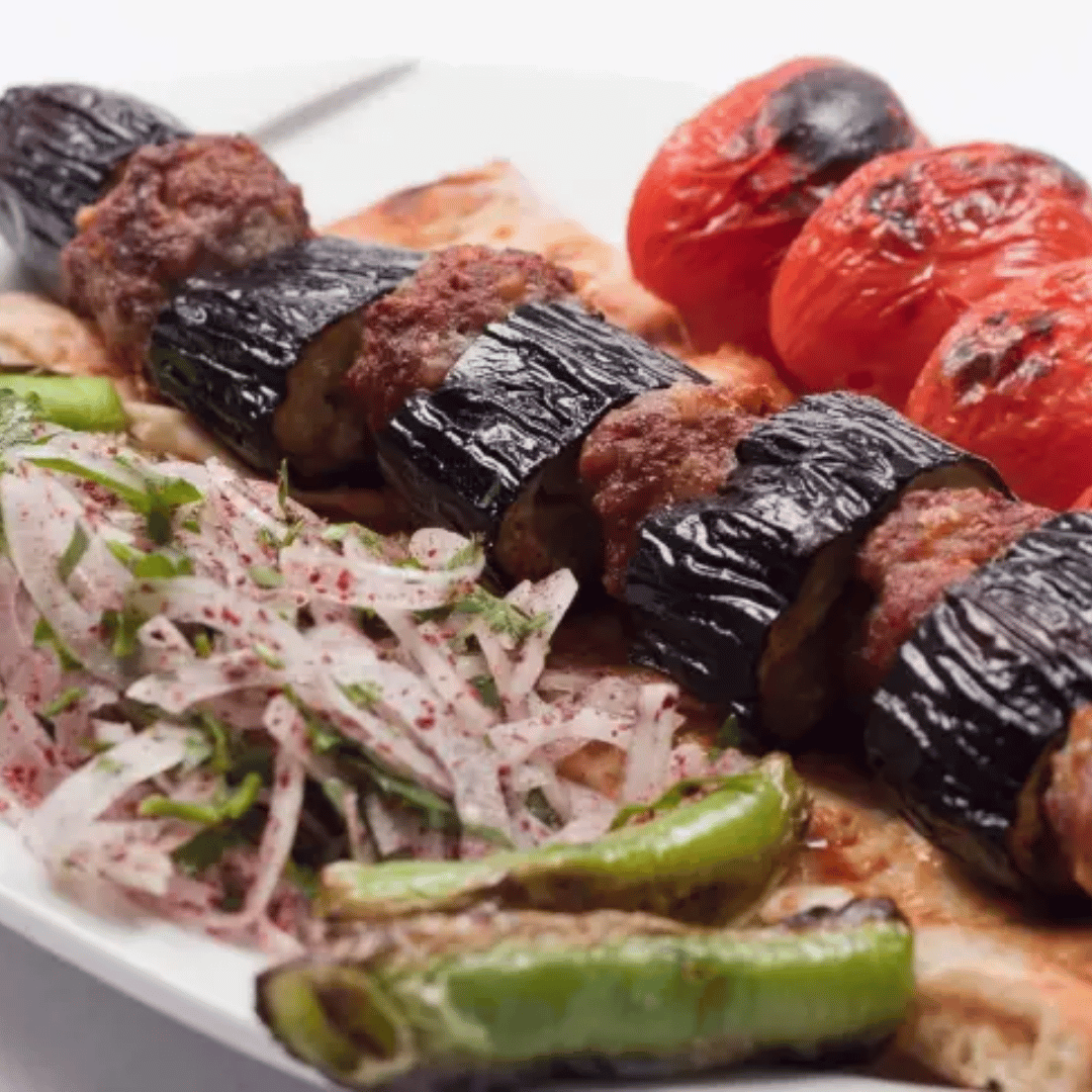 Izgara şiş kebabın közlenmiş patlıcanlı yoğurt yatağı üzerinde sunulduğu, dengeli ve doyurucu bir kebap lezzetidir.