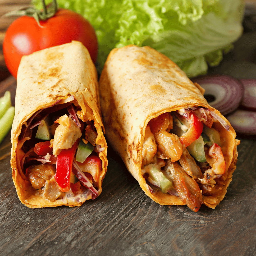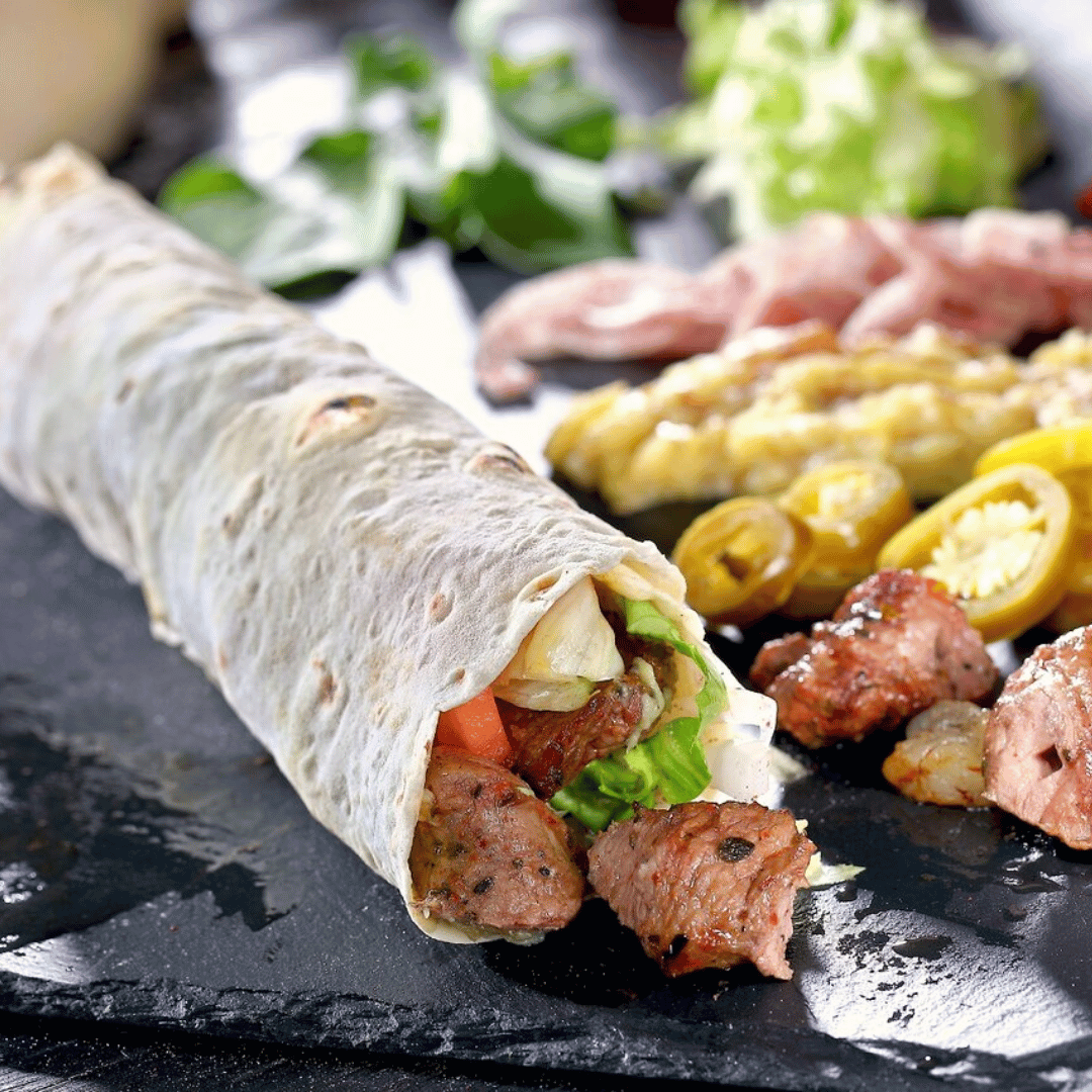 Döner ve çöp şiş lezzetlerinin dürüm halinde sunumu.