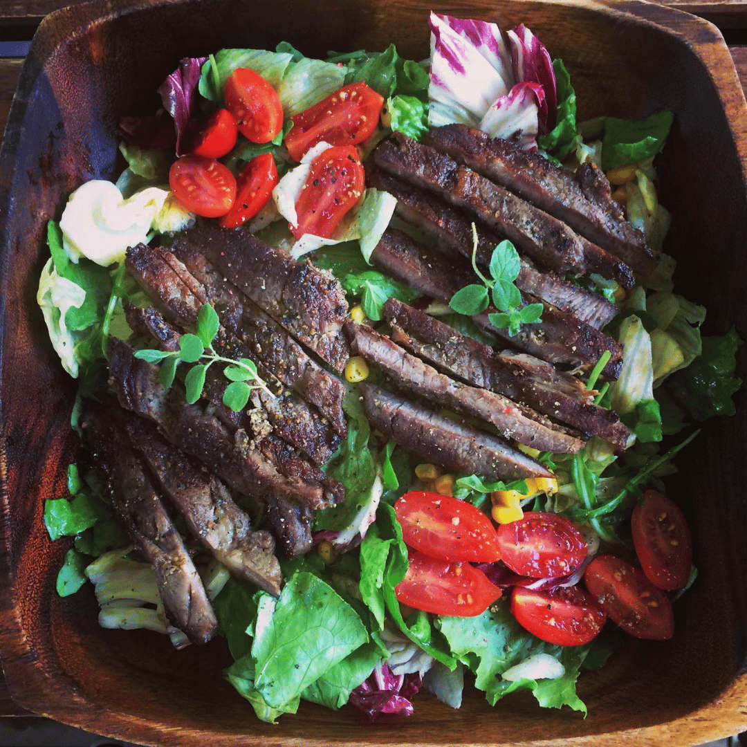 Izgara biftek dilimleriyle doyuruculuğu artırılmış seçkin bir salata.